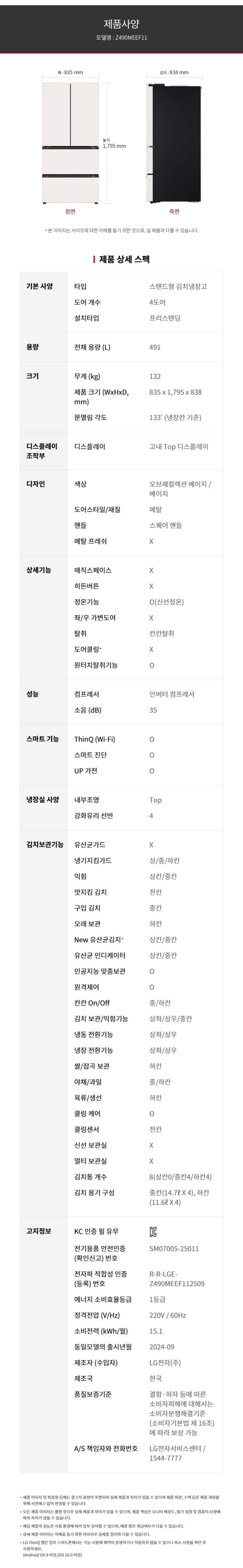 [LG] 디오스 AI 오브제컬렉션 김치톡톡 491L Z490MEEF11