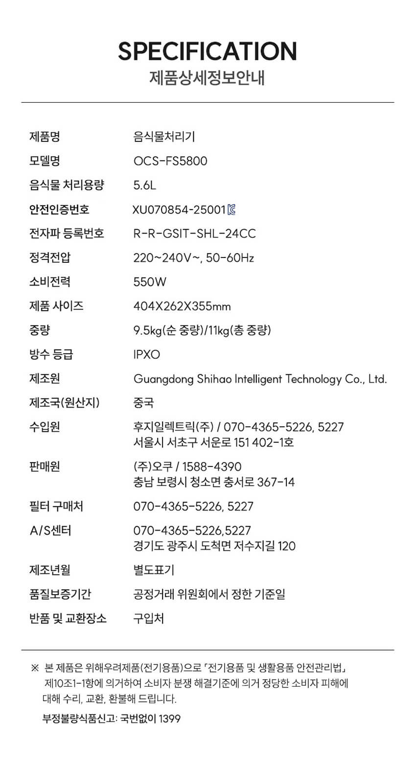 [오쿠] 원터치형 플리오 대용량 음식물처리기 건조분쇄기 5.6L OCS-FS5800